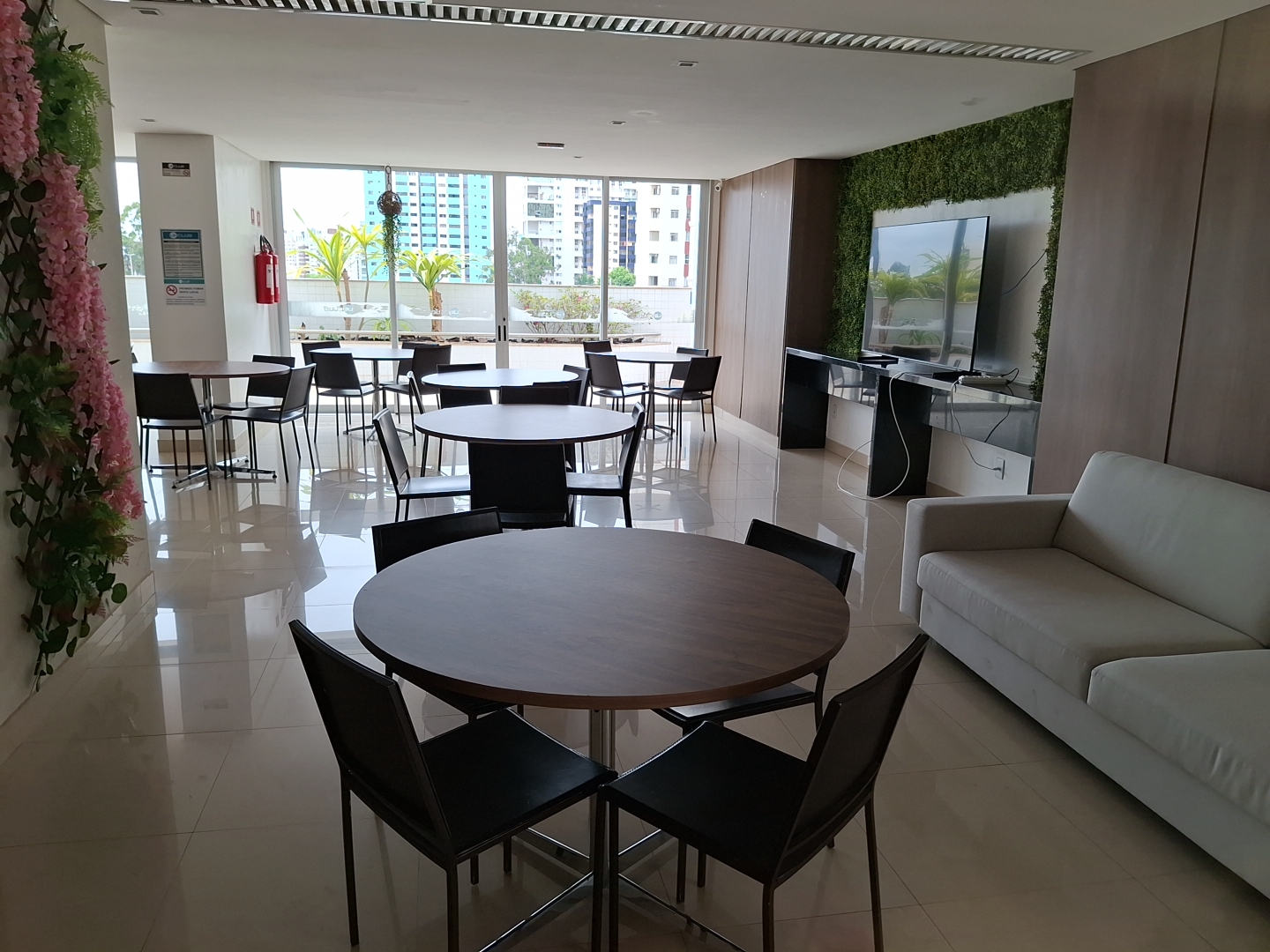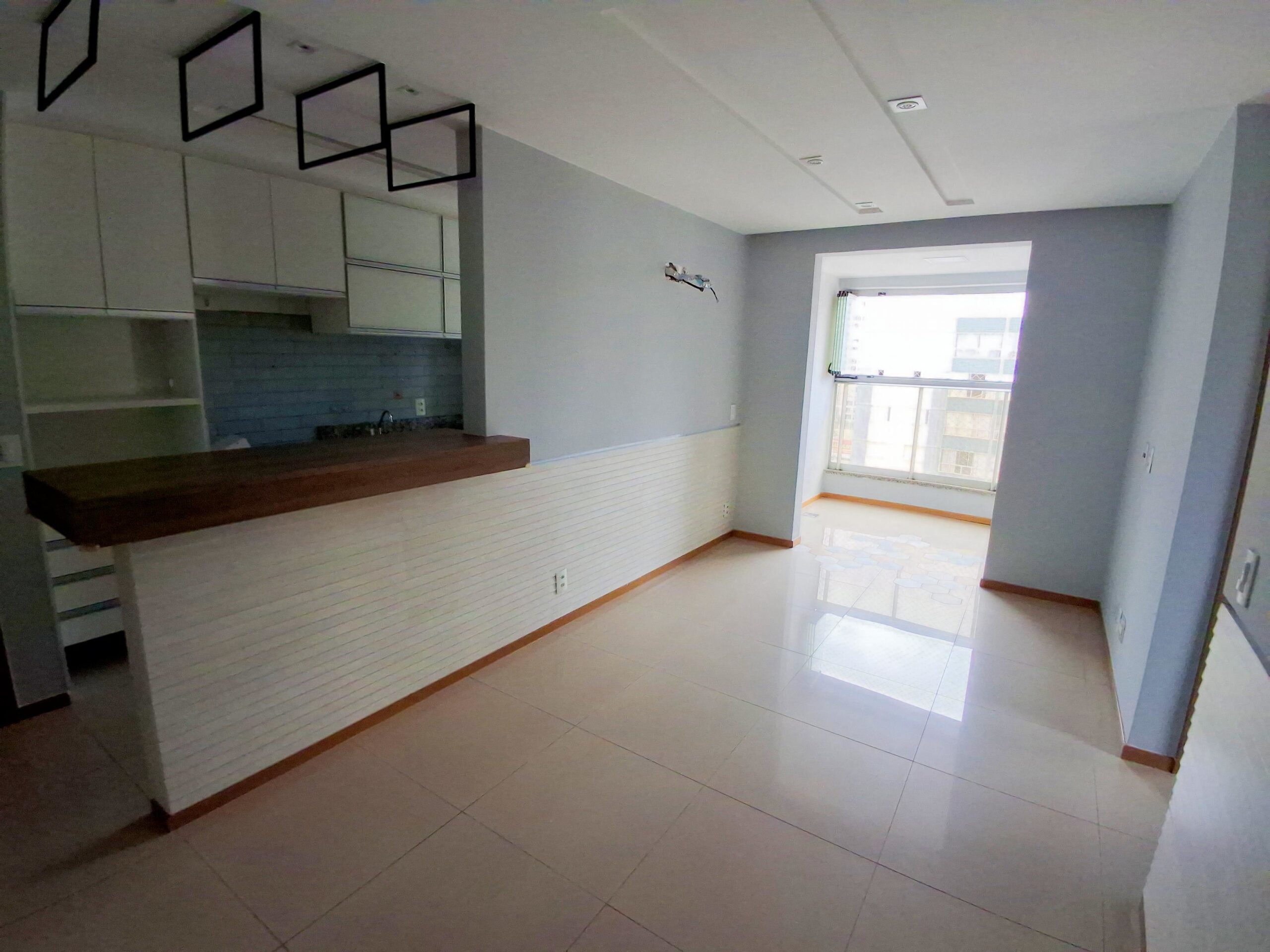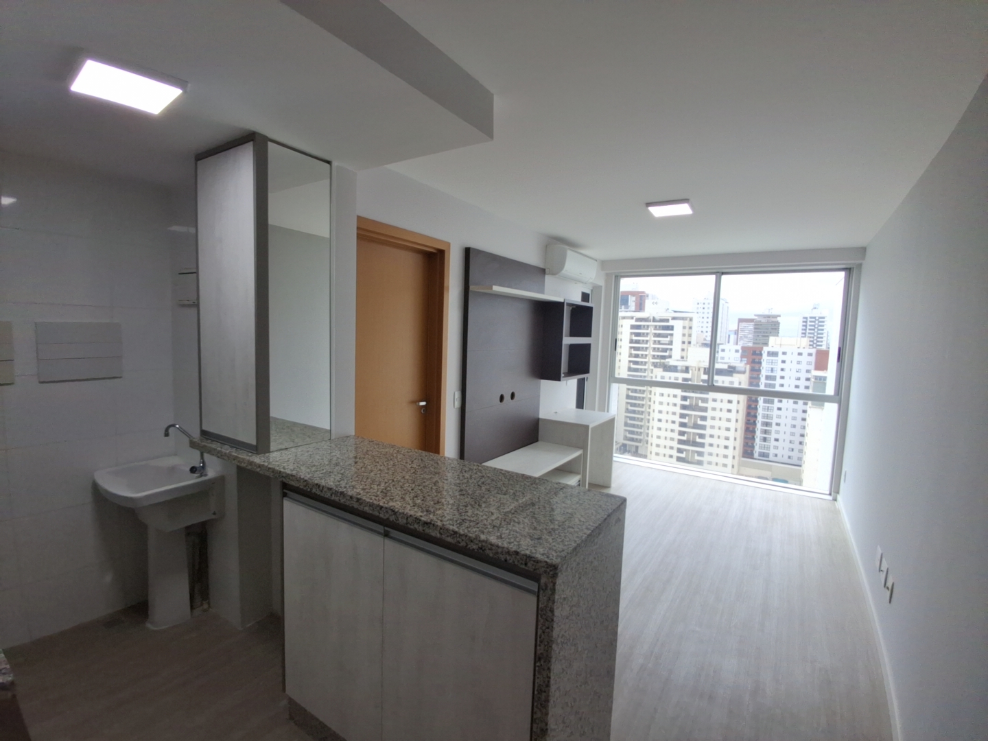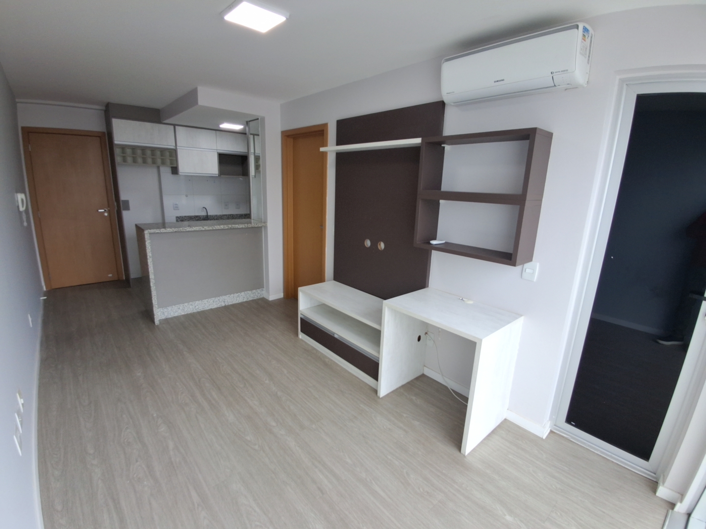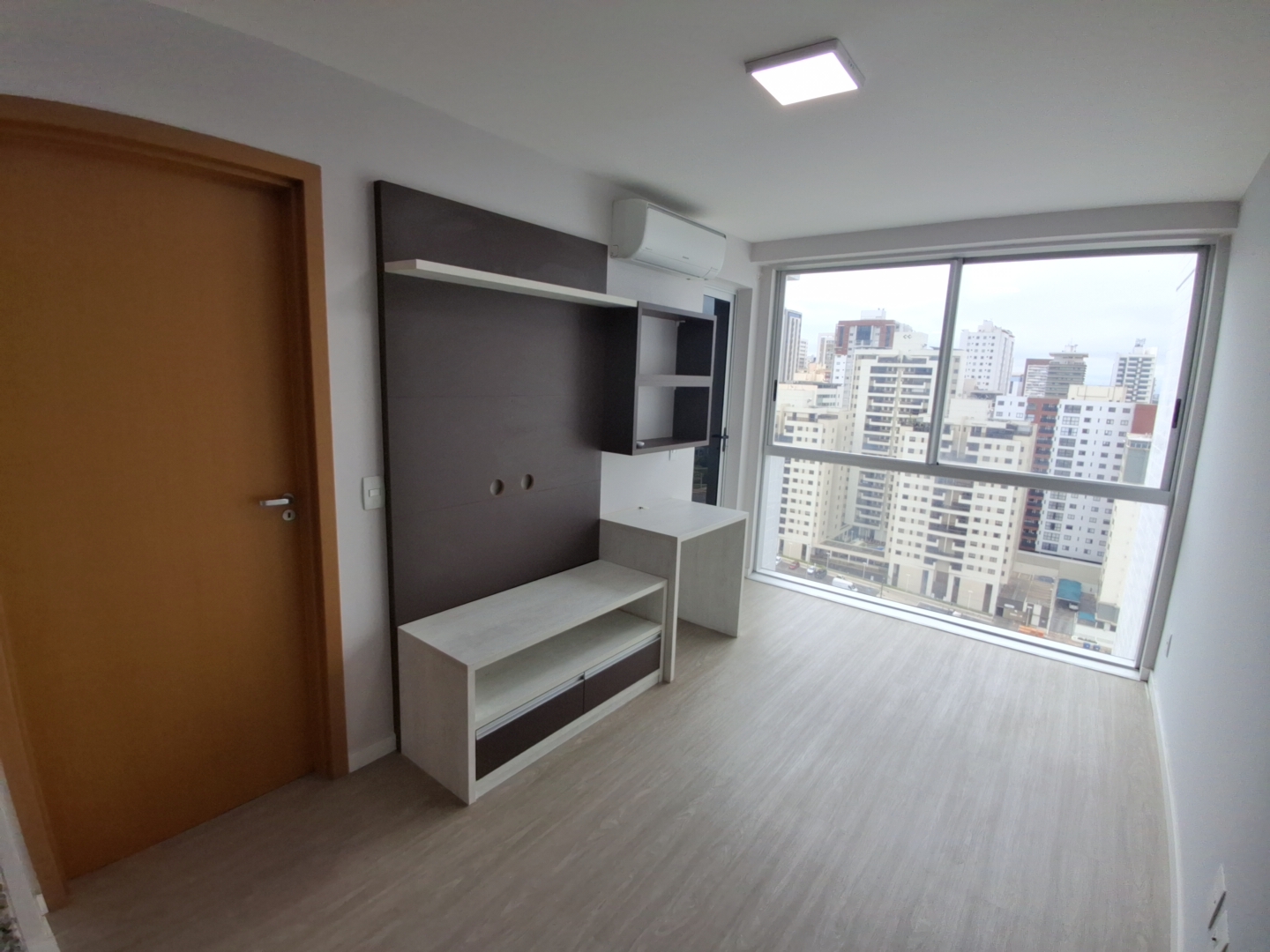 Sala: Ambiente integrado com painel de TV e Ar Condicionado.