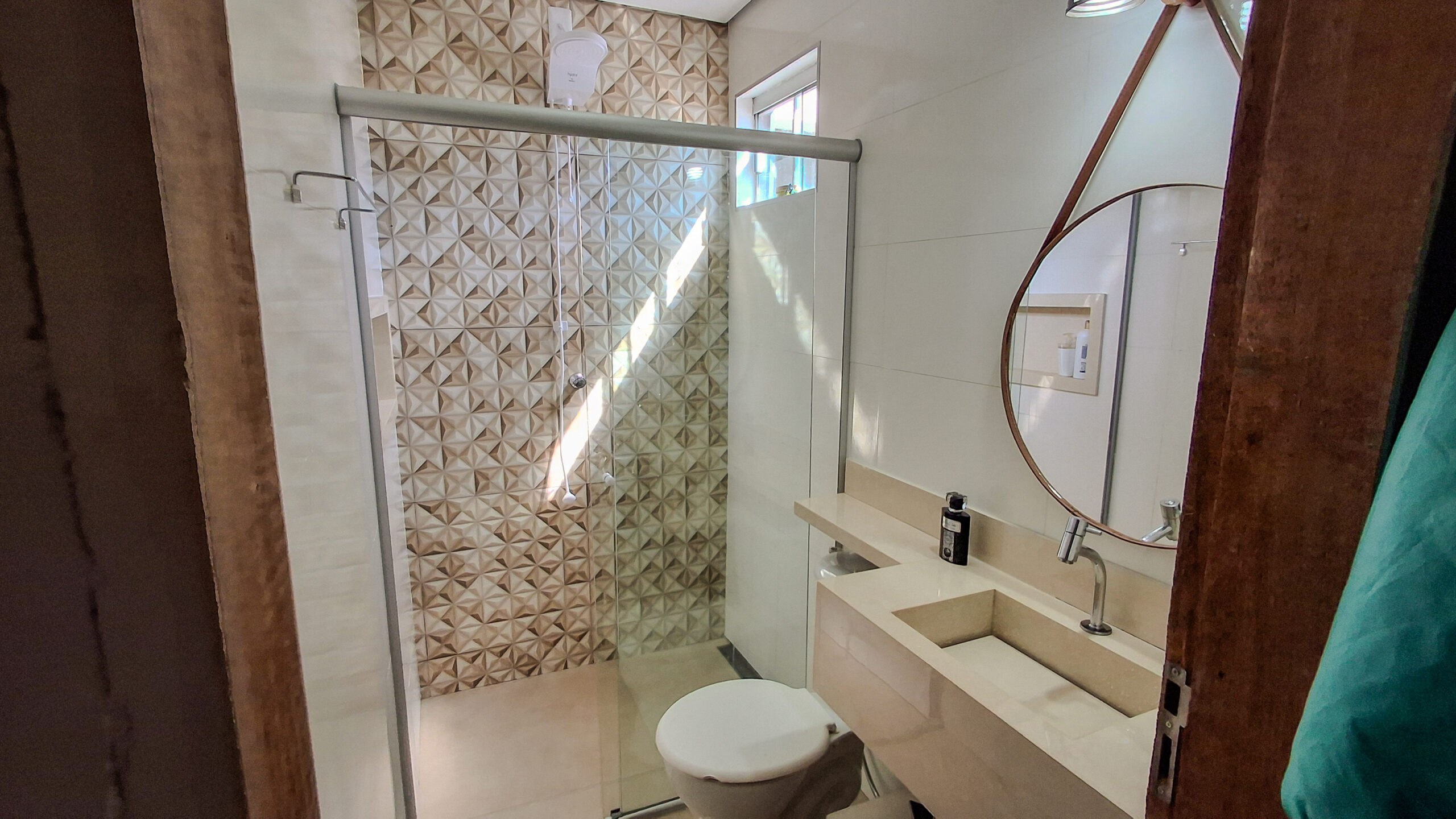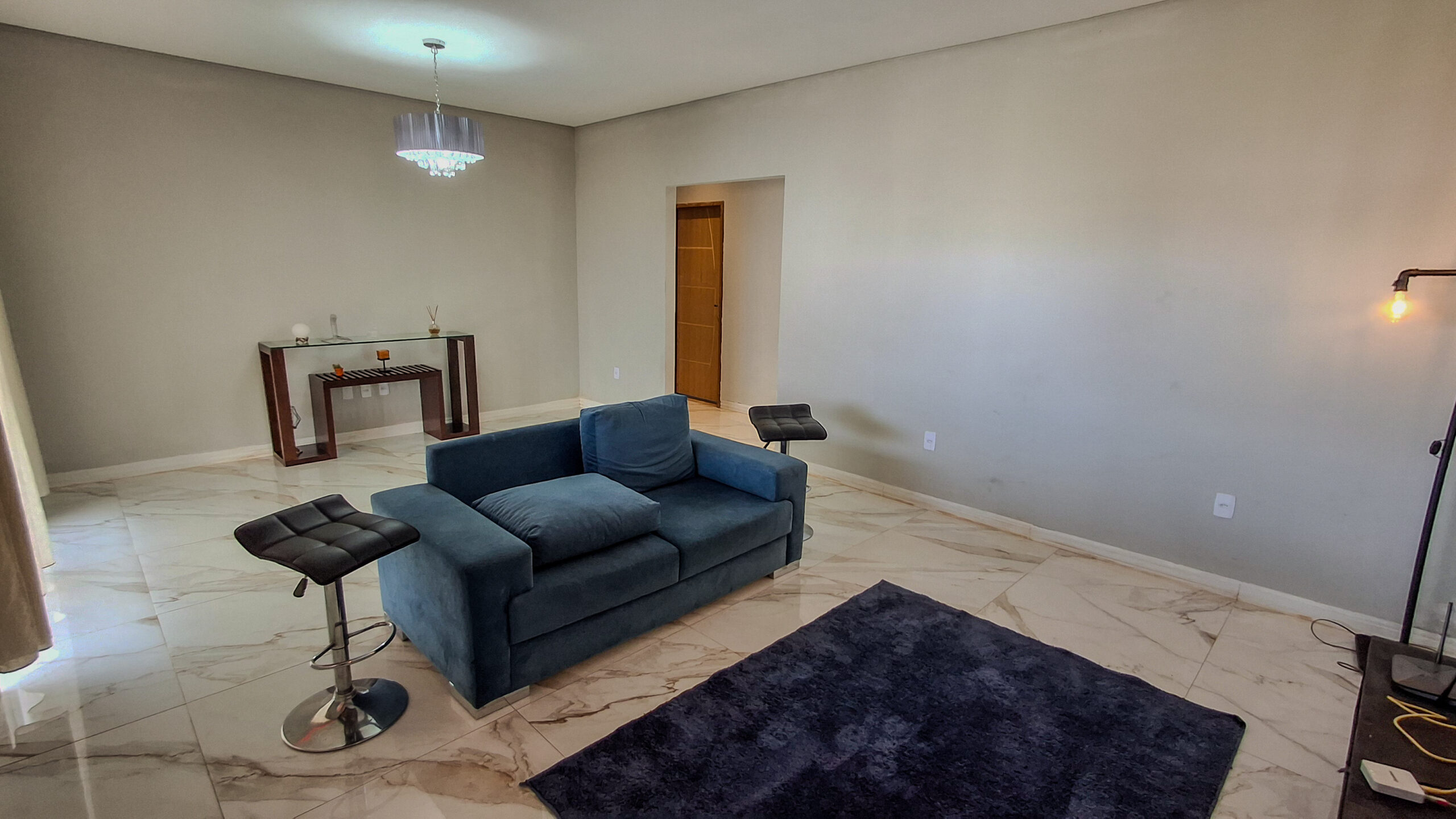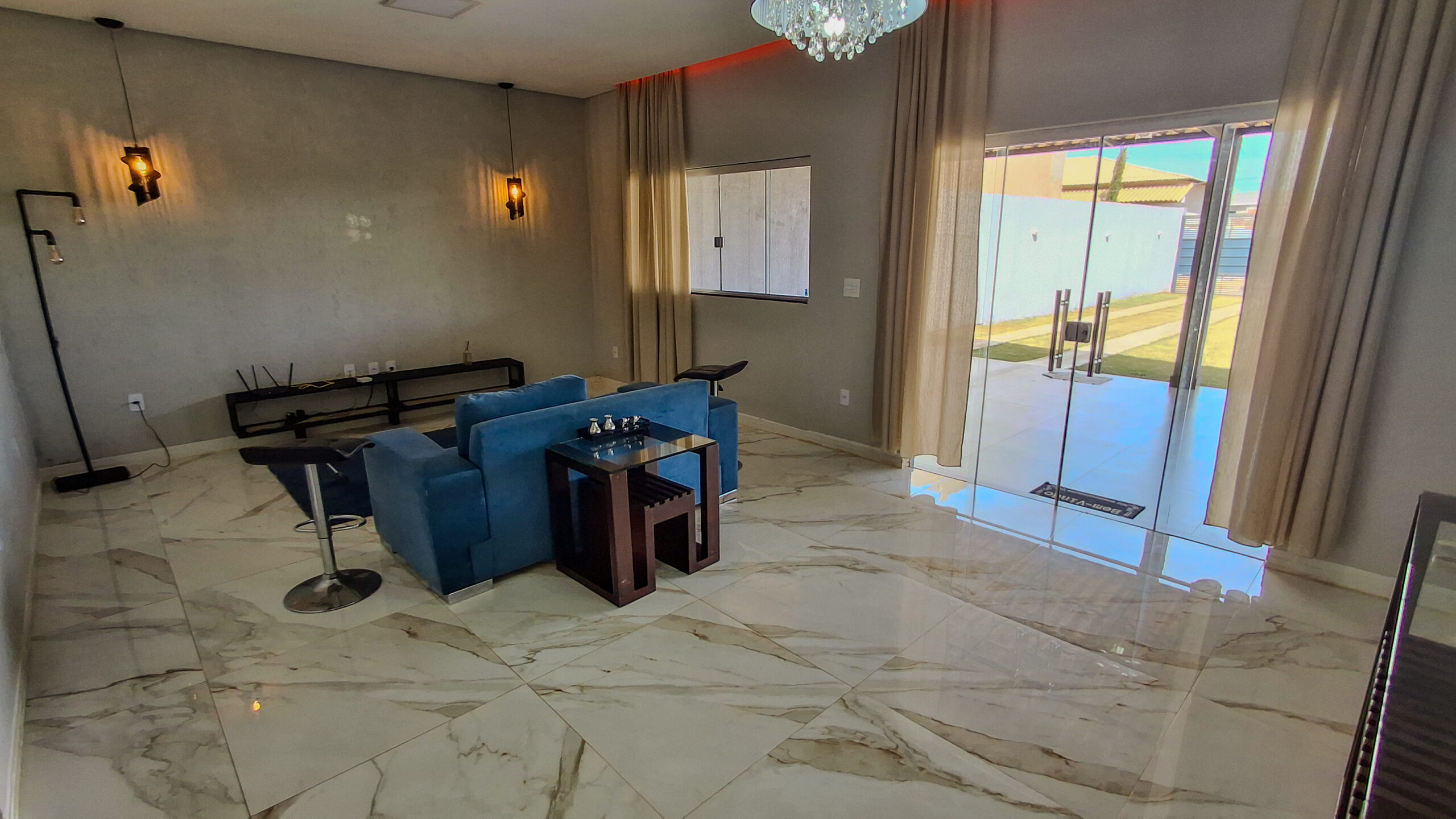 Ao entrar na casa, a sensação é de amplitude e conforto. A sala de estar ampla se integra naturalmente aos demais ambientes, enquanto o piso em porcelanato em toda a residência reforça o acabamento moderno e elegante.