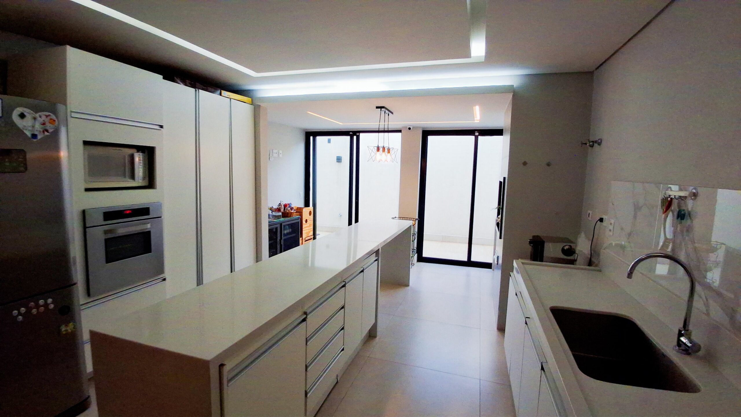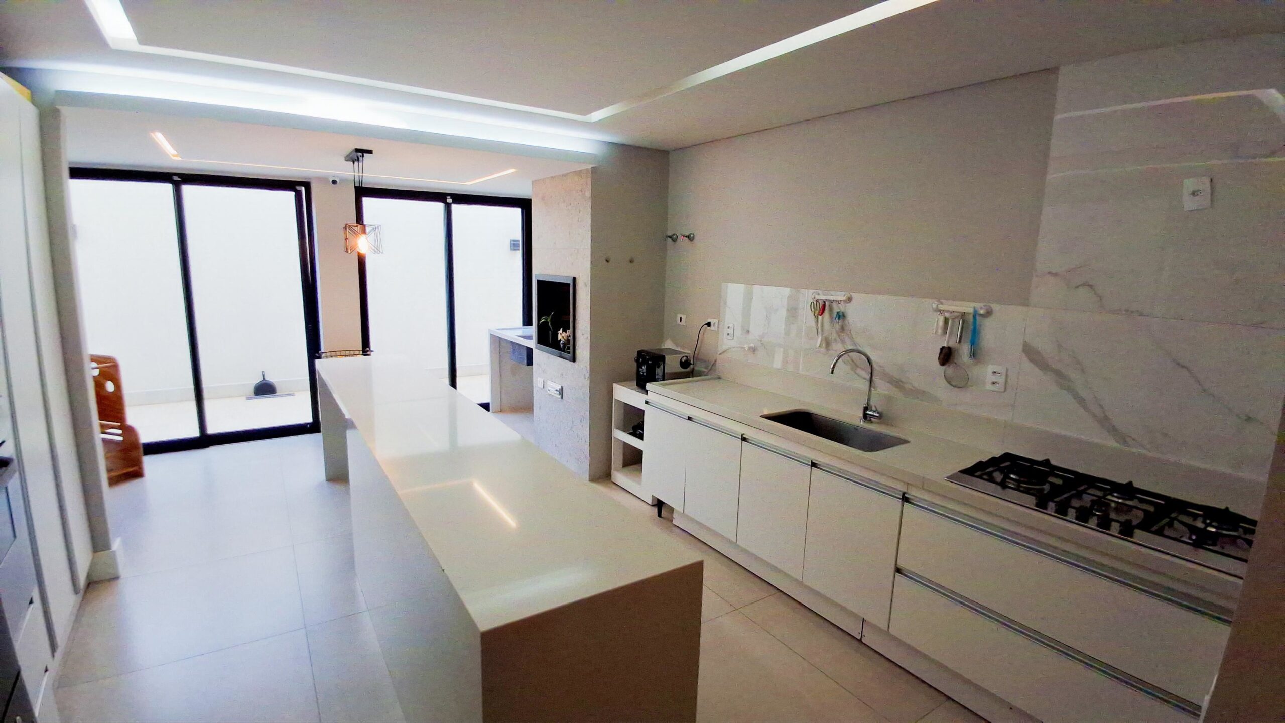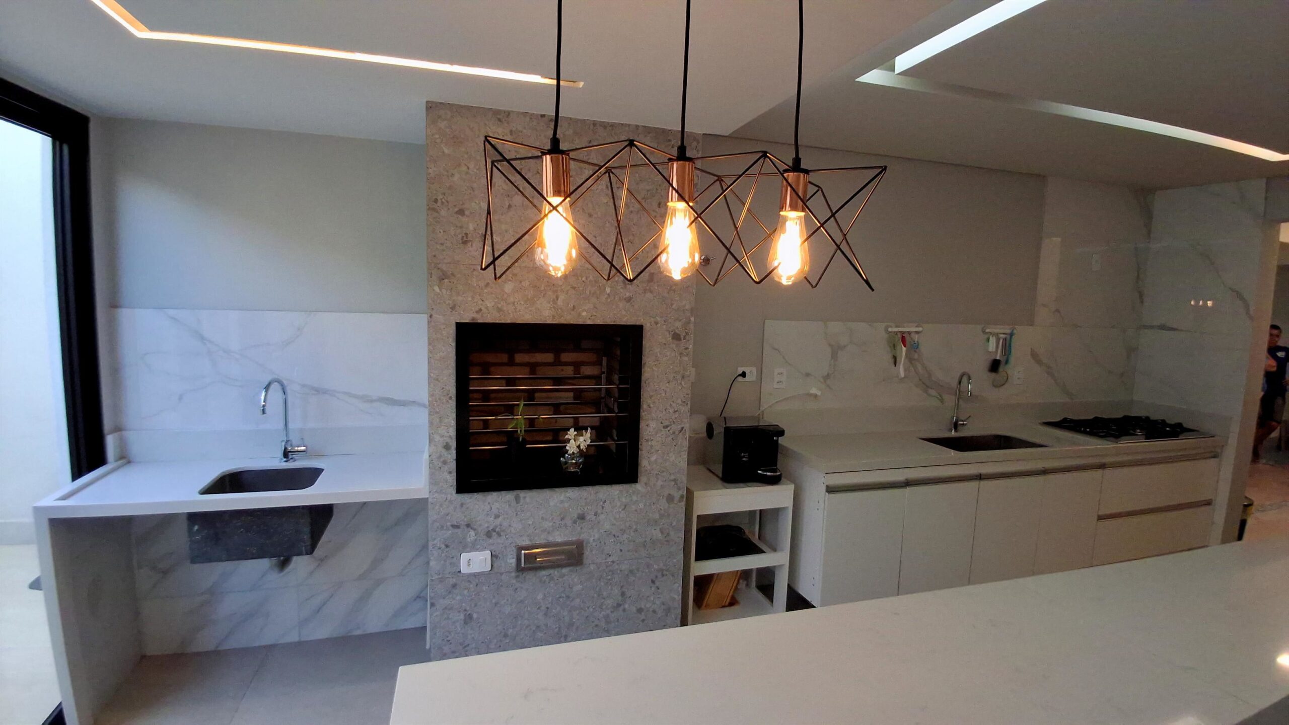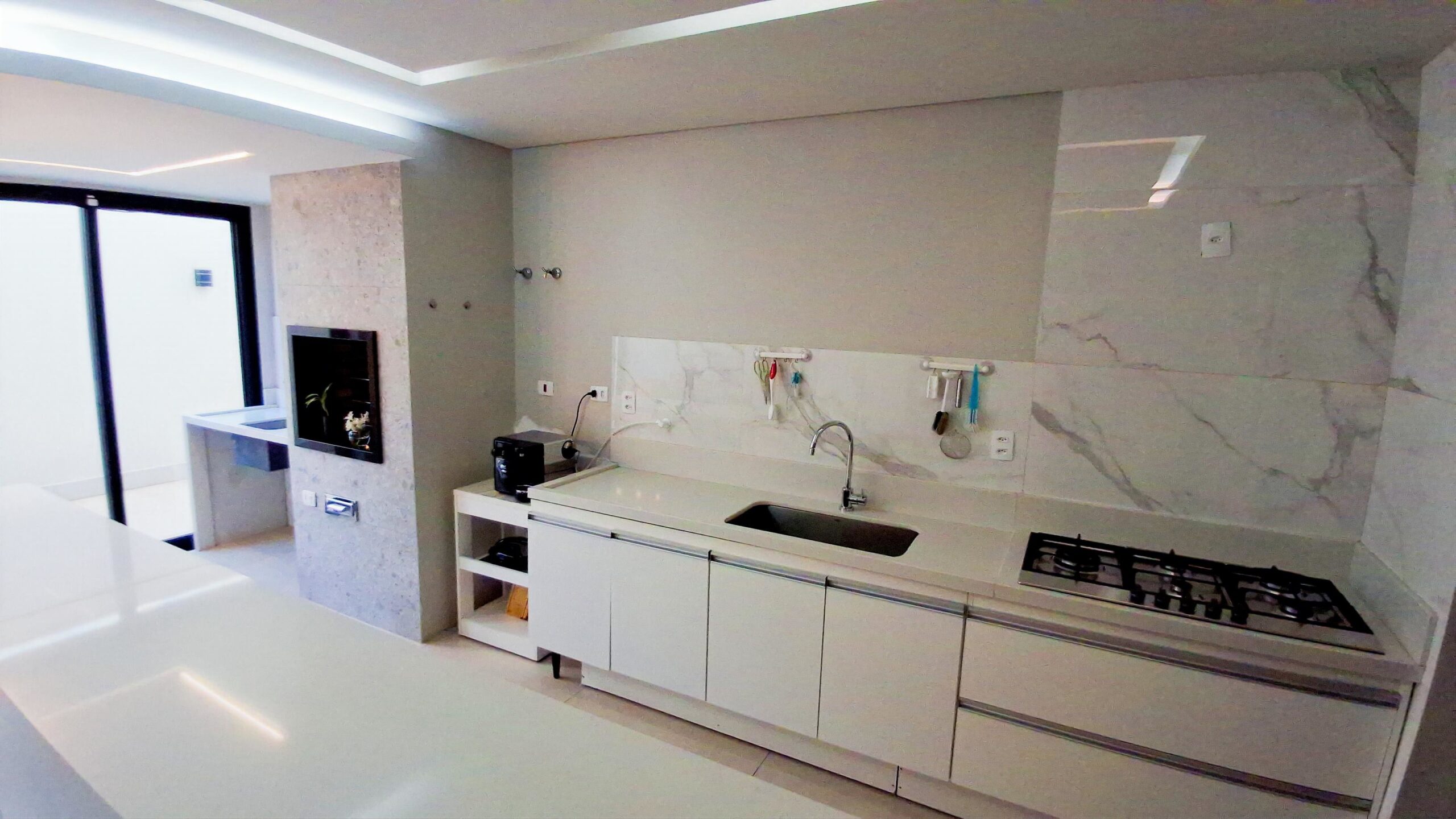 • Cozinha planejada com armários sob medida, bancada e ilha em granito branco prime, churrasqueira integrada e projeto luminotécnico.
