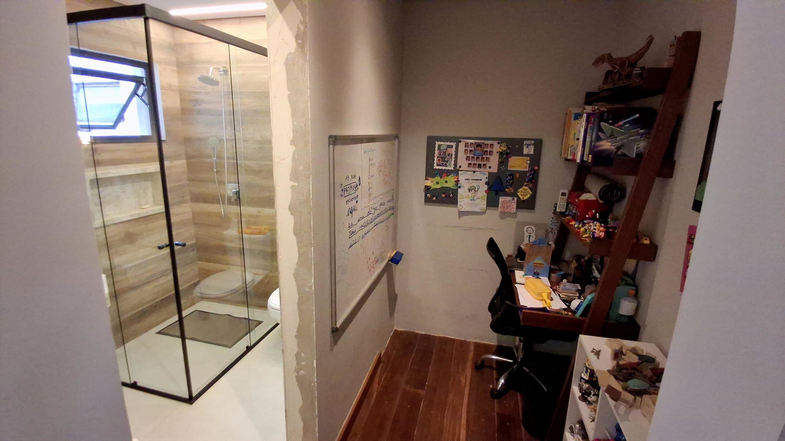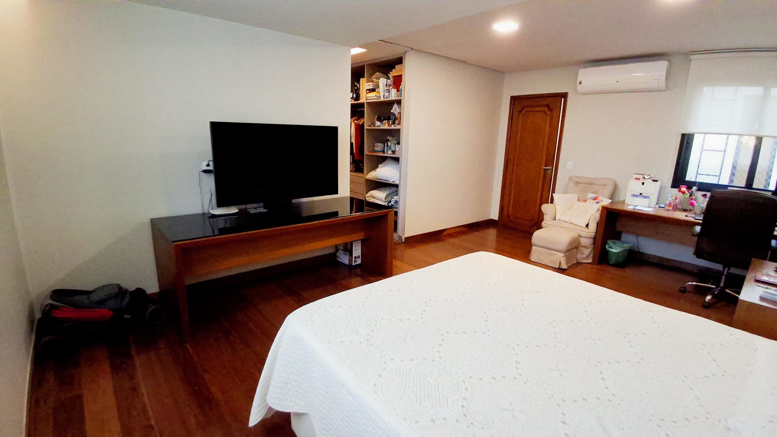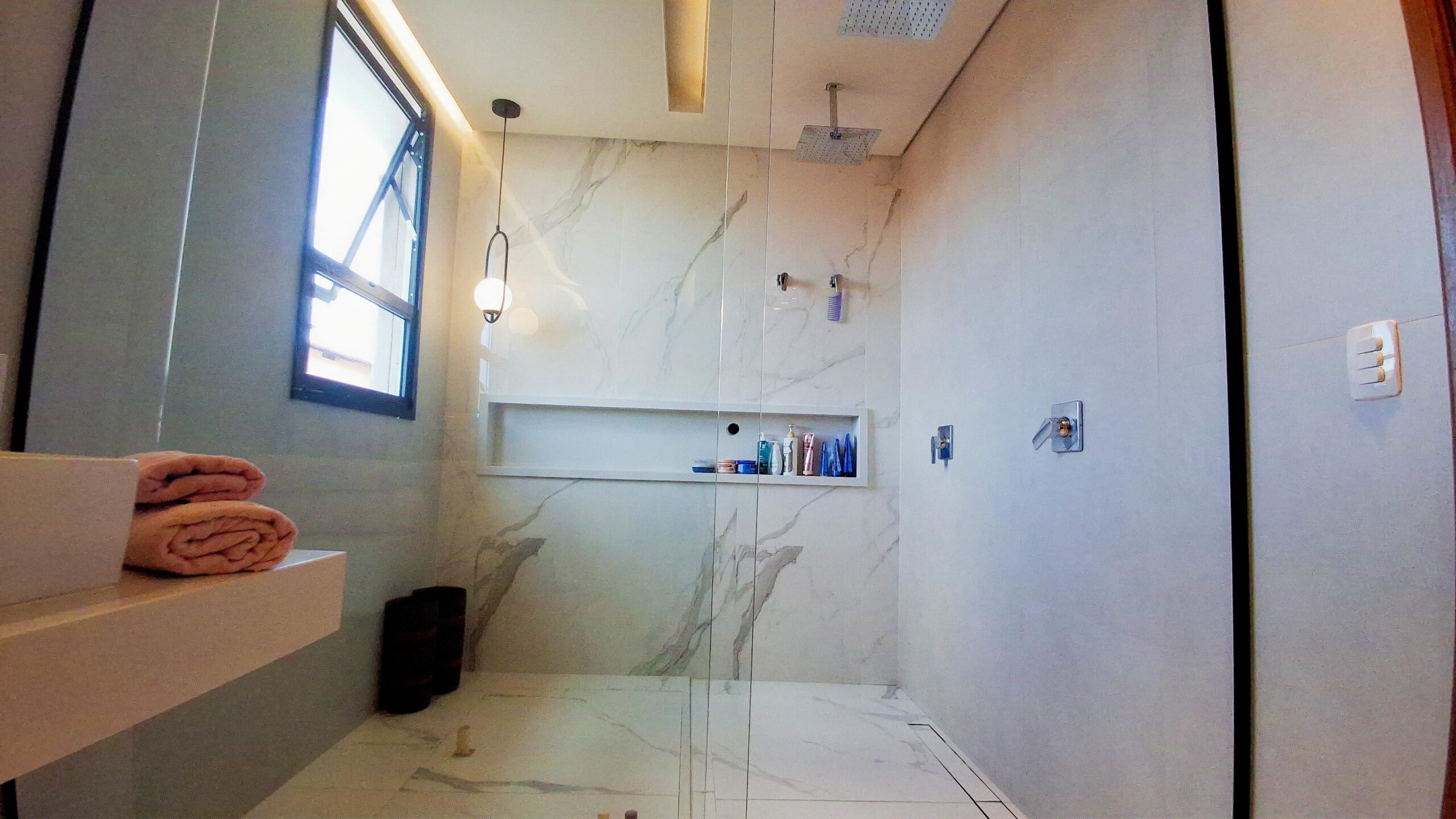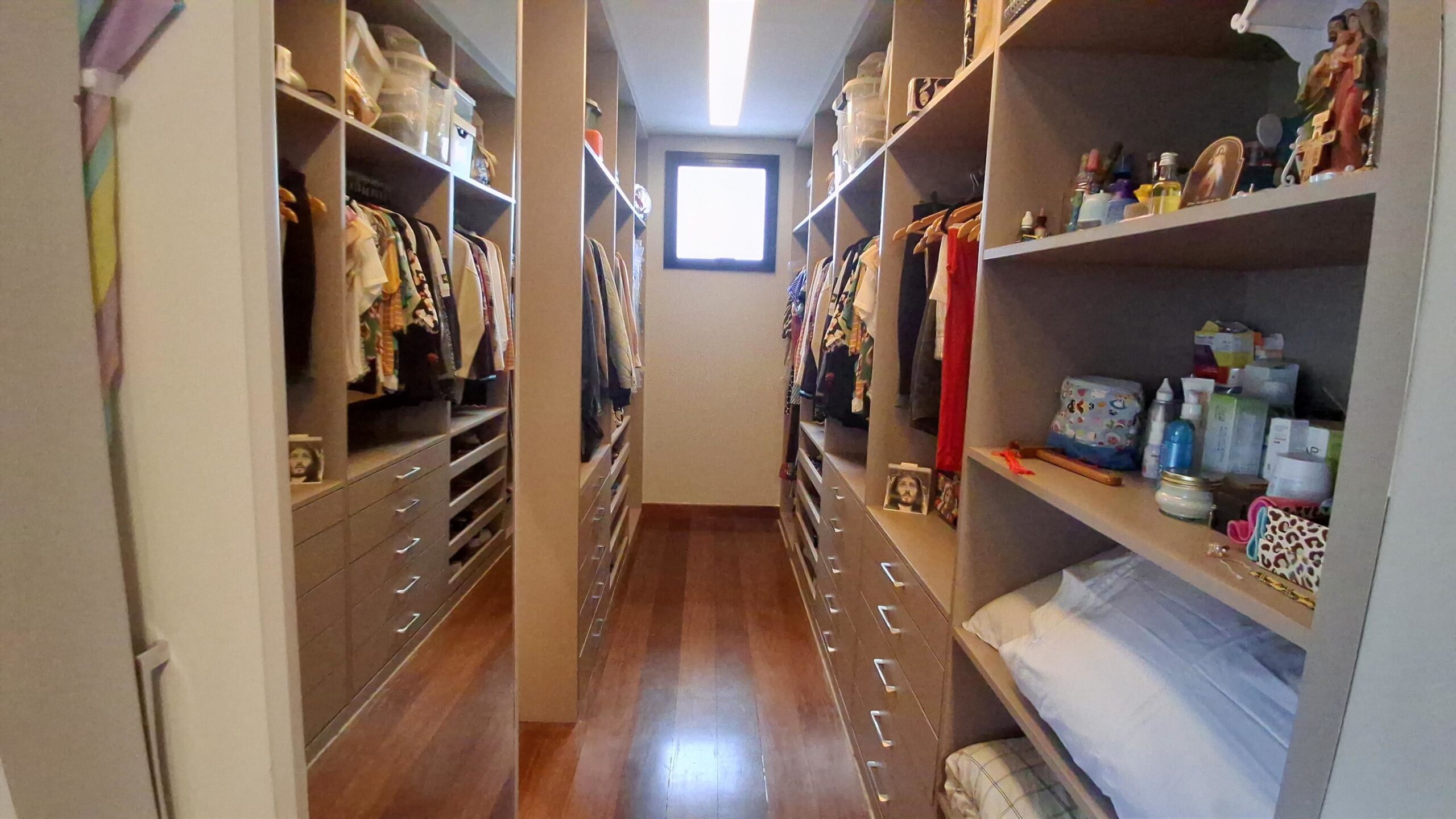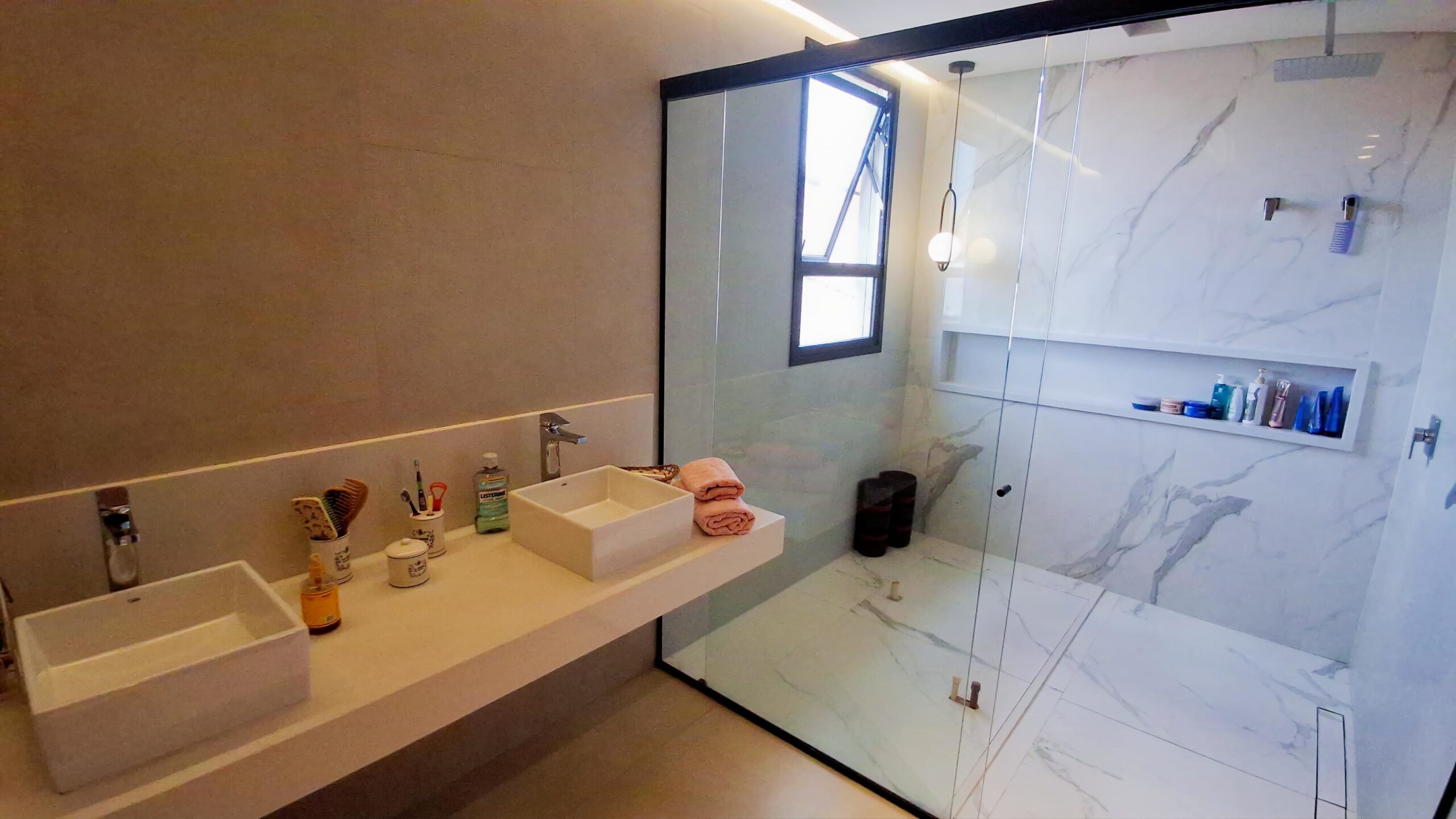 • Suíte Master com closet, ar-condicionado, piso em madeira, banheiro com cuba dupla, ducha dupla e espaço para hidromassagem.